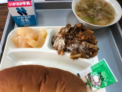 今日の給食の献立は、なすのミートグラタン、鶏肉と野菜のスープ、白桃(カット缶)ソフトマーガリン、パン、牛乳でした。ひき肉となすは相性がよく、こってりした味付けですが、子どもたちの好きな献立です。鶏肉と野菜のスープは、野菜の甘さが溶け込んでいて、さっぱりとしたスープでした。白桃もカットされていてさわやかな甘さで食べやすかったです。