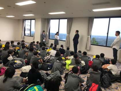 6年生がホテルに到着しました。開舎式をして、ホテルの方にご挨拶をしました。