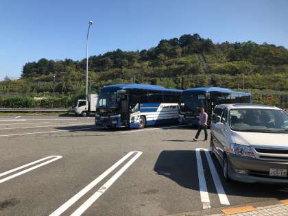 修学旅行最後の信楽に向けてバスで移動中です。嬉野でトイレ休憩をとりました。