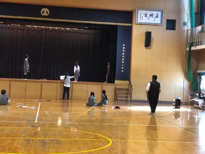 6時間目は今度は5年生が舞台で練習していました。さすが5年生は、実際の流れにそって、細かい立ち位置などにも気をつけて練習しています。