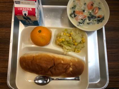 今日の給食の献立は、帆立貝のクリームシチュー、キャベツとコーンのサラダ、みかん、パン、牛乳でした。帆立貝のエキスの溶け込んだシチューは体の中から温めてくれます。キャベツとコーンがしゃきしゃき感のあるサラダもさっぱりとして食べやすかったです。みかんも旬の味でした。
