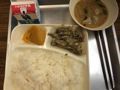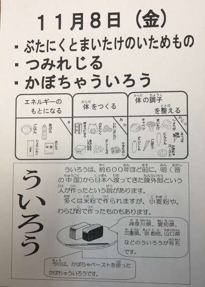 今日の給食の献立は、豚肉と舞茸の炒め物、つみれ汁、かぼちゃういろう、ご飯、牛乳でした。舞茸の美味しさが引き立つ炒め物に、たくさんの野菜と煮込まれたつみれ汁はご飯によく合います。かぼちゃういろうは優しい甘さでした。
