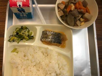 今日の給食の献立は、さごしのおろし醤油かけ、五目豆、小松菜と白菜の甘酢和え、ご飯、牛乳でした。さごしは柔らかく焼かれていて、おろし醤油がさっばりとした味付けでした。五目豆には、鶏肉やこんぶ、ごぼうなどがたくさん入っていて、かみごたえがありました。小松菜には、体の成長を助け、目の働きをよくするカロテンや歯や骨を丈夫にするカルシウム、貧血を予防する鉄などがたっぷり入っているそうです。栄養のバランスがよく考えられた献立でした。