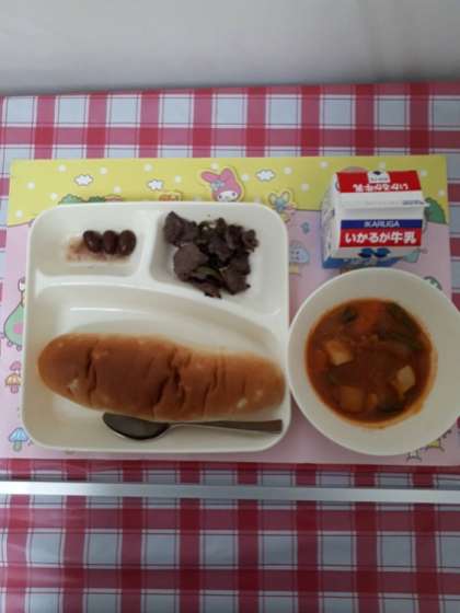 今日の給食は、牛肉の香味焼き、ケチャップ煮、うずら豆のグラッセ、おさつパン、牛乳でした。オールスパイスでの香り付けがとても効いています。ケチャップ煮も、野菜のそれぞれの食感や味の良さをトマトソースが際立たせていて、おいしいです。うずら豆のグラッセは、ほんのり甘い仕上がりになっています。