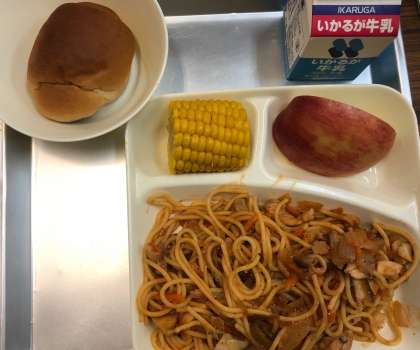 今日の給食の献立は、きのこのスパゲティ、焼きとうもろこし、りんご、パン、牛乳でした。エリンギ、しいたけ、しめじなどのきのこがたくさん入ったスパゲティは、子どもたちに人気ですの焼きとうもろこしも食べやすくて、りんごはとてもジューシーでした。