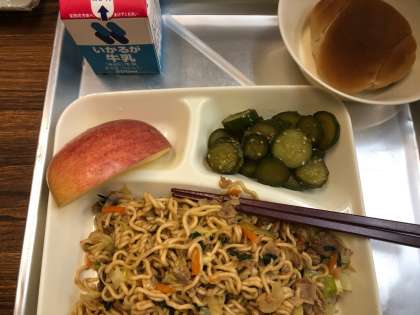 今日の給食の献立は、オイスターソース焼きそば、きゅうりの中華和え、りんご、パン、牛乳でした。オイスターソースのよくきいた焼きそばは、たくさんの野菜もとることができます。きゅうりにはごま油や砂糖、米酢、濃口醤油が染みていて、歯応えもありました。りんごを食べると口の中がさわやかな甘さでいっぱいになりましたなりました。