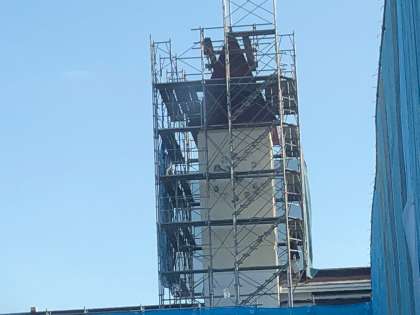 壁面塗装の工事は今が真っ最中です。とんがり帽子の時計台は今、きれいに塗り直されているところです。