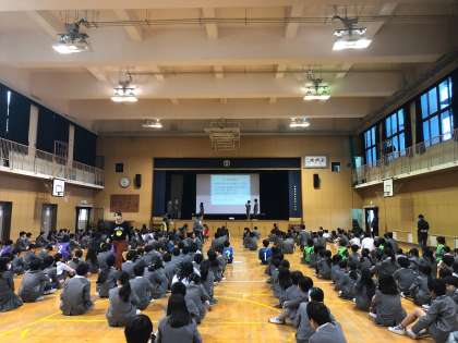 今朝の児童集会は、名前集めゲームでした。縦割り班で輪になって座り、集会委員会から出たお題にあったものをたくさん書いたチームが優勝です。「黄色いもの」「果物」の名前をみんなで集めていました。