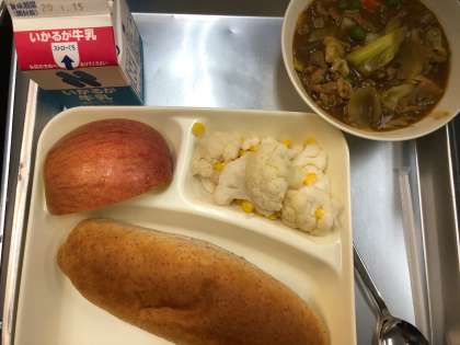 今日の給食の献立は、豚肉と野菜のカレー煮、カリフラワーとコーンのサラダ、りんご、パン、牛乳でした。豚肉の旨味がカレーに染み渡っていて、人気のメニューです。カリフラワーは、緑のグループの食べ物で、「主に体の調子を整える働き」があります。つぼみの部分にビタミンCが多く含まれています。りんごも甘くて歯応えがあり、バランスの良い献立でした。