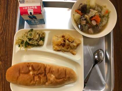 今日の給食の献立は、ポトフ、カレーソテー、桃のクラフティ、パン、牛乳でした。ポトフは肉や野菜、香草煮込んだフランスの家庭料理です。給食には牛肉、ウィンナー、じゃがいも、キャベツ、にんじん、パセリが入っていました。スープにしみだした牛肉の旨味が味わえました。カレーソテーももやしやピーマンが食べやすく調理されていました。桃のクラフティもデザートとして美味しかったです。パンにはさつまいもが入っていて、とても柔らかかったです。