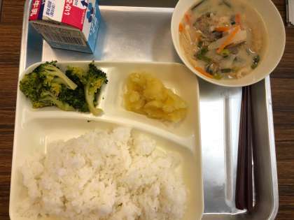 今日の給食の献立は、かす汁、ブロッコリーの生姜漬け、栗きんとん、ご飯、牛乳でした。かす汁には、鮭や薄揚げ、にんじん、大根、青ネギなどがたくさん入っていて、出汁のきいた深い味わいでした。ブロッコリーは歯応えがよく、生姜がきいていて食べやすかったです。栗きんとんもお正月によく出てきますが、豊かな生活が今年も送れるようにとの願いが込められています。