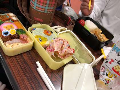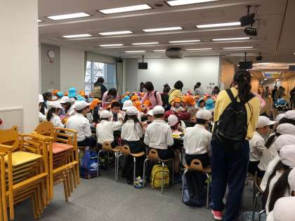 2年生は時間通りに集合して、お弁当タイムです。部屋の中なので寒くなく、お家の人が作ってくださったお弁当を美味しく食べることができました。午後もあと少し、楽しんでから帰ります。