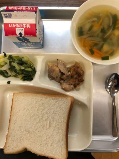 本日の給食は、鶏肉のオイスターソース焼き、えびととうふのスープ、チンゲンサイのピリ辛あえ、パン、バター、牛乳です。とうふなどの具材がゴロゴロ入ったスープ、鶏肉はオイスターソースの味付けがしっかりついていて、それでいて柔らかいです。チンゲンサイは少しのピリ辛具合が食をすすめてくれます。