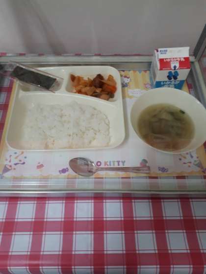 今日の給食は、酢豚、中華スープ、ご飯、焼きのり、牛乳でした。