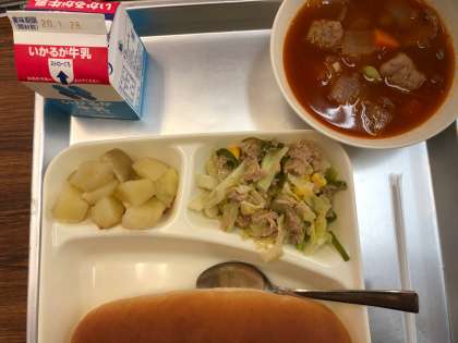 昨日の給食の献立は、ミートボールのケチャップ煮、ツナと野菜のソテー、焼きじゃがパン、牛乳でした。ミートボールがトマト味で煮込まれていて、体が温まります。ツナと野菜のソテーは食べやすく親しみのある味わいでした。焼きじゃがには、メークインが使われていました。塩味がちょうどよくホクホクしておいしかったです。
