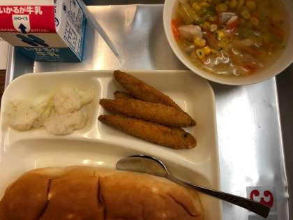 今日の給食の献立は、わかさぎフライ、白菜のスープ、カリフラワーのサラダ、パン、牛乳でした。わかさぎは骨が柔らかくカリッと揚げられていて、丸ごとおいしく食べることができました。白菜のスープにはコーンが入っていて子どもたちが食べやすいように工夫されていました。カリフラワーのサラダもさっぱりしていて、さつまいもパンともよく合っていました。