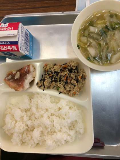 本日の給食の献立は、あかうおのしょうゆだれがけ、うすくず汁、高野どうふのいり煮、ご飯、牛乳でした。高野どうふのいり煮はひじきも入っていて、栄養満点。あかうおの焼き具合はバッチリで、たれの味付けも丁度良く、うすくず汁は、とろみがあって身体があたたまります。