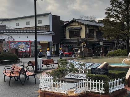 6年生は映画村に到着しました。さっそくお侍さんを見つけて駆け寄る子どもたち。刀で切られる格好して、楽しんでいました。