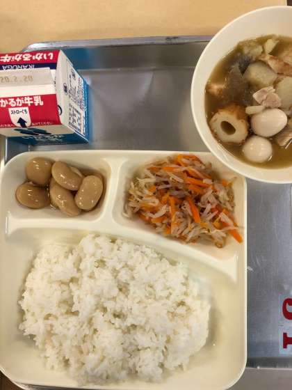 本日の献立は、関東煮、もやしとにんじんの甘酢あえ、白花豆の煮もの、ご飯、牛乳でした。関東煮は、一つ一つの具材をあえて少し大きめにカットされていて、しっかり噛むことで、染み込んだお出汁を味わうことができます。もやしと人参の甘酢あえは、シャキシャキ感が良く、白花豆の煮ものは、ふっくらほくほくで味がしみこんでいました。