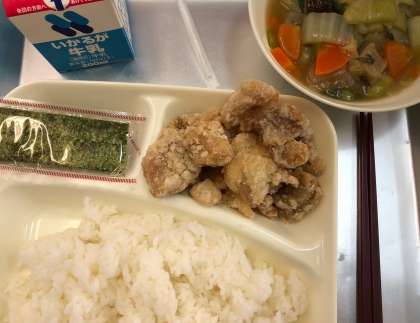 今日の給食の献立は、鶏肉の唐揚げ、まるてんと野菜のうま煮、焼きのり、ご飯、牛乳でした。鶏肉の唐揚げは、子どもたちに大人気です。まるてんは魚のすり身に調味料を加え、丸く形を整え、油で揚げたものです。玉ねぎやにんじん、しいたけ、青梗菜、白菜などの野菜の旨味がとけ込んだとろみのある味付けでした。