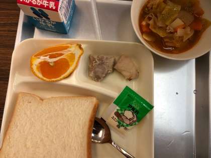 今日の給食の献立は、鶏肉のガーリック風味焼き、豚肉と野菜のケチャップ煮、デコポン、パン、牛乳でした。焼き物機で焼かれた鶏肉は、外はカリッと中はジューシーでした、豚肉と柔らかく煮込まれた野菜がケチャップ味が染み込んでおいしく仕上がっていました。デコポンはさわやかな酸味がありました、