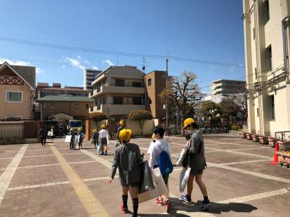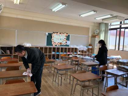 午前中の子どもたちが下校しました。その後は教職員が机や椅子、廊下、階段などを消毒して、午後からの子どもたちを迎えます。