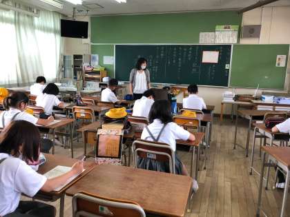 教室で子どもたちは間隔を開けて座り、担任の先生から新しい課題などの説明を受けています。