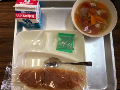 今日の給食の献立は、フレッシュトマトのスープ煮、パン、牛乳、りんごジャムでした。新鮮なトマトの酸味と野菜の旨味が染み込んだスープ煮はそれぞれの具材の本来の味がしました。