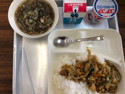 今日の給食の献立は、和風カレー丼、もずくとオクラのとろり汁、ヨーグルト、牛乳でした。和風カレー丼には薄揚げや野菜が入っていて、カレーの風味が食欲をそそります。もずくとオクラのとろみが優しい、出汁の効いた汁は丼によくあっていました。