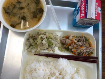 今日の給食の献立は、豚肉と野菜の炒め物、味噌汁、キャベツの赤紫蘇和え、ご飯、牛乳でした。豚肉と野菜の風味を生かした味付けで、野菜本来の味が生かされている炒め物でした。味噌汁は出汁の効いたこくのある味、キャベツの赤紫蘇和えもキャベツの食感が感じられました。子どもの間に食材そのものの味を知ることは大事なことと思います。