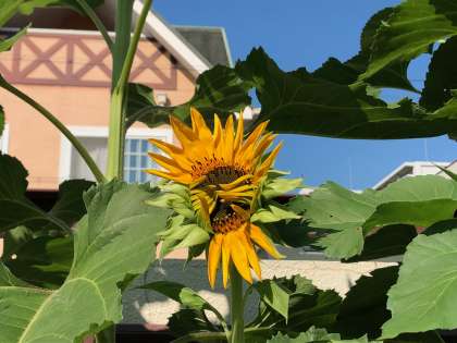 校門の横に植えられたひまわりが一輪だけ咲きました。まだ花びらが開ききっていません。背丈はもう2メートルを超えています。