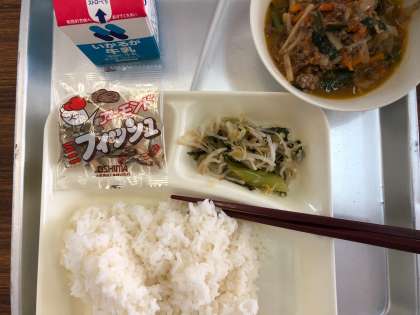 今日の給食の献立は、マーボー春雨、青梗菜ともやしの甘酢和え、アーモンドフィッシュ、ご飯、牛乳でした。つるっとした春雨とひき肉やたくさんの野菜が絡まって、とてもいい味わいでした。青梗菜ともやしも甘酢でさっぱりとした仕上がりでした。歯を丈夫にするためにはよく噛むことが大事です。アーモンドフィッシュを食べることは、栄養面だけでなく歯にもいいことです。