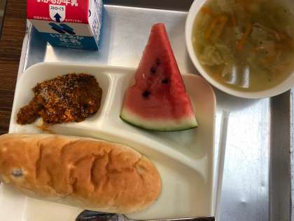今日の給食の献立は、かぼちゃのミートグラタン、スープ、すいか、パン、牛乳でした。かぼちゃのミートグラタンは、かぼちゃがホクホクしていて、ひき肉もたくさん入っていて、食べ応えがありました。スープは、よく煮込まれた野菜や鶏肉の旨味が詰まっていて、一気に飲み干したくなる味でした。パンの白いところはさつまいもで、もっちりした食感とさつまいものほんのりした甘さが特徴です。すいかは、とても甘くて、子どもたちも「スイカや!」と喜びの声をあげていました。