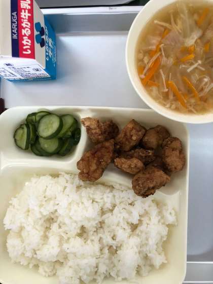 本日の給食は、豚肉の香味あげ、すまし汁、あっさりきゅうり、ご飯、牛乳でした。