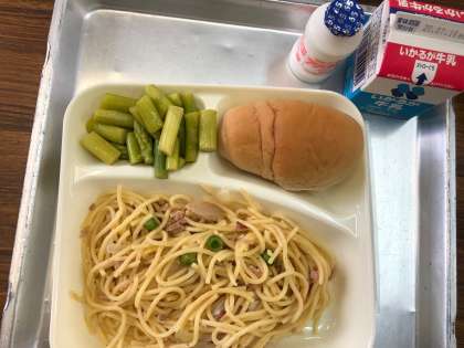 今日の給食の献立は、ポークトマトスパゲッティ、グリーンアスパラガスのサラダ、発酵乳、パン、牛乳でした。ポークトマトスパゲッティには生のトマトが使われています。トマトのパワーは、皮膚やのど、鼻の粘膜を丈夫にし、体の抵抗力をたかめたり、食物繊維でお腹の掃除をしてくれたりします。ちょうどよい塩味とさわやかなトマトの酸味でたくさん食べることができました。グリーンアスパラガスもあっさりとしていて、茹で加減もよく、アスパラガスの食感がよかったです。