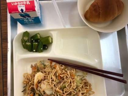 今日の給食の献立は、オイスターソース焼きそば、オクラの甘酢和え、パン、牛乳でした。テンメンジャンとオイスターソースで味付けされた焼きそばは暑い季節でも食べやすかったです。オクラもさっぱりとしていて焼きそばにもよく合いました。
