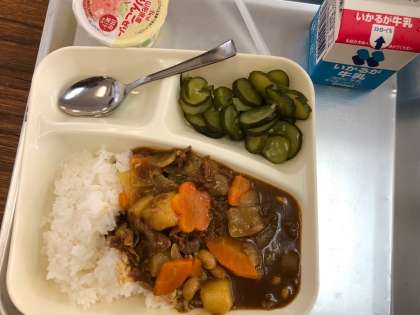 今日の給食の献立は、牛肉と大豆のカレーライス(米粉)、きゅうりのピクルス、りんごゼリー、牛乳でした。スパイシーなカレーは暑い時期にぴったりで、米粉を使ってアレルギーにも対応しています。花型のラッキーにんじんが入っていました。きゅうりのピクルスはあっさりとしていて、カレーに合いました。りんごゼリーは冷たくてのどごしがよかったです。