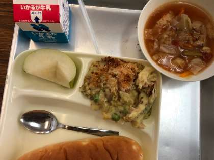 今日の給食の献立は、豆乳マカロニグラタン(米粉)、トマトスープ、梨(二十世紀)パン、牛乳でした。グラタンは、アレルギー対応給食として、豆乳や米粉でつくったマカロニ、上に乗っているいるパン粉も米粉でできています。トマトスープは、さっぱりとしたトマトの酸味やセロリなどの野菜の香りがきいていました。今日のパンはおさつパンでした。