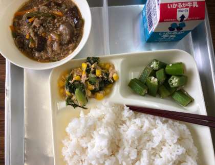 今日の給食の献立は、麻婆茄子、オクラの甘酢和え、ツナと青梗菜の炒め物、ご飯、牛乳でした。麻婆茄子にはひき肉がたっぷりで、なすやにんじん、玉ねぎ、ピーマンなどが彩りを添えています。少し辛口でご飯が進みました。オクラはさっぱりした甘酢の味わいと食感が楽しめました。ツナは、コーンとよく炒められ青梗菜がよく合っていました。