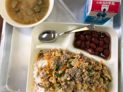 今日の給食の献立は、他人丼、冬瓜の味噌汁、金時豆の煮物、牛乳でした。他人丼は、卵や牛肉などがふわふわしていて、食べやすかったです。透き通った冬瓜の味噌汁は丁寧にとられた出汁が香っていました。金時豆はいんげん豆の仲間で赤紫色が鮮やかで「赤いんげん」と呼ばれます。炭水化物やタンパク質、食物繊維をたくさん含んでいるそうです。柔らかくふっくらと煮込まれていました。