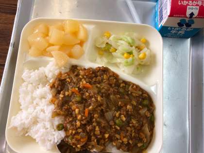 今日の給食の献立は、大豆入りキーマカレー[米粉]、キャベツとコーンのサラダ[ノンエッグドレッシング]、白桃(カット缶)、牛乳でした。米粉のカレーやノンエッグドレッシングなどアレルギーに対応した献立です。キーマカレーにはひき肉と引き割り大豆が入っていて、ボリューム満点で食べ応えがありました。キャベツとコーンのサラダはさっぱりしていてカレーによく合いました。