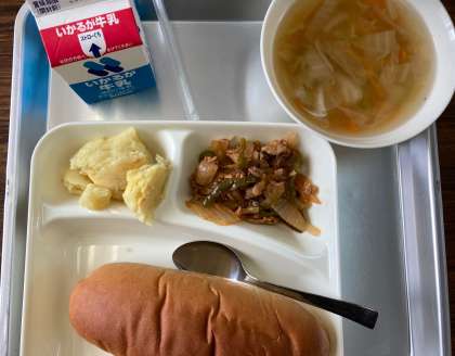 今日の給食の献立は、豚肉と野菜のケチャップソテー、スープ、スィートポテトパン、牛乳でした。豚肉と野菜にケチャップがよく絡まって旨味が感じられる味付けでした。スープには、コーンやパセリがアクセントになっていました。さつまいもは、旬の野菜です。自然の甘みをいかしたスィートポテトでした。