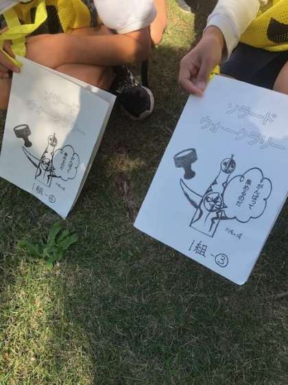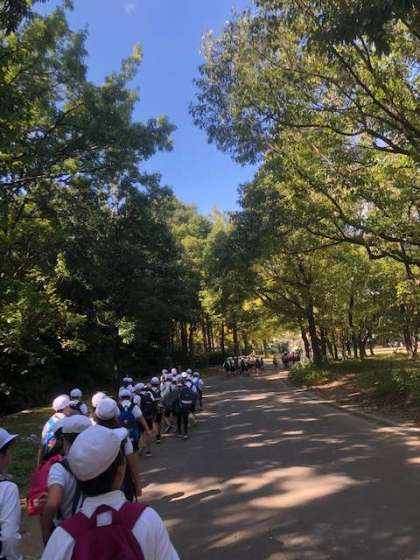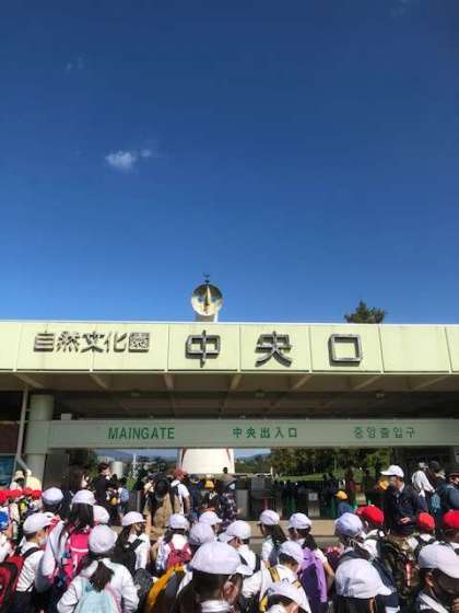 自然文化園に到着しました。太陽の塔のそばを通り抜け、今からウォークラリーの開始です。