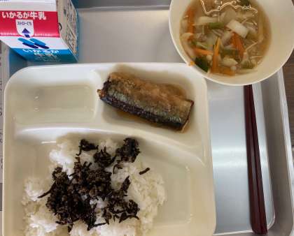 今日の給食の献立は、さんまのみぞれかけ、味噌汁、牛ひじきそぼろ、ご飯、牛乳でした。さんまには、体をつくるたんぱく質や体の調子を整えるビタミンB2が多く含まれています。また、脂質には脳の働きを助ける成分や血管の病気を予防する成分などが含まれています。油の乗ったさんまが香ばしく焼かれていて、大根おろしが口の中をさっぱりとさせてくれました。牛ひじきそぼろをかけるとご飯が進みます。だしのきいた味噌汁は優しい味付けでした。