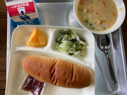 今日の給食の献立は、コーンクリームシチュー【米粉】、キャベツと三度豆のサラダ、柿(平核無柿)、パン、牛乳でした。コーンクリームシチューは、にんじんやグリンピースの彩りがよく、柔らかいじゃがいもや味わい深いベーコンなどが優しい味付けで作られていました。キャベツと三度豆も優しい味わいでした。柿は秋が旬で、平核無柿は、渋を抜いてから食べる「渋柿」の一種だそうです。ビタミンCやカロテンなどの栄養素が含まれています。