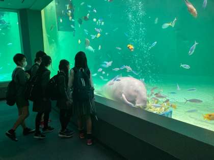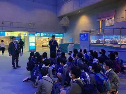 鳥羽水族館で見学中です。たくさんの海の生き物がいて驚きの声をあげていました。