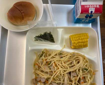 今日の給食の献立は、ウィンナーときのこの醤油風味スパゲッティ、焼きとうもろこし、パン、牛乳でした。今日のスパゲッティには、椎茸としめじが入っていて、醤油風味によくあっていました。焼きとうもろこしも香ばしかったです。
