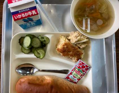 今日の給食の献立は、ツナポテトオムレツ、スープ、きゅうりのバジル風味サラダ、パン、牛乳でした。ツナとポテトの入ったオムレツは、ボリームが食べ応えがありました。スープには、豚肉、ウィンナーソーセージの他に玉ねぎ、キャベツ、にんじん、コーンなど具沢山で、パセリの風味がありました。きゅうりのサラダは、バジルがきいていて、歯応えもありおいしかったです。