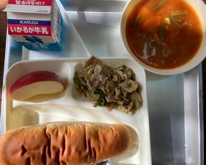 今日の給食の献立は、豚肉のカレー風味焼き、ケチャップ煮、りんご、パン、牛乳でした。豚肉はカレーの香りが香ばしくしっかりとジューシーに焼けていました。ケチャップ煮に入っているじゃがいもなどの野菜は口の中でほぐれるほどよく煮込まれていました。りんごは口の中を爽やかにしてくれる味わいでした。