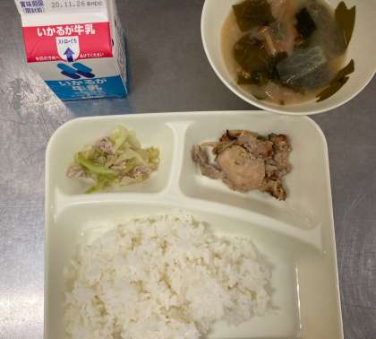 今日の給食の献立は、鶏肉のごまだれ焼き、なめこの味噌汁、キャベツの炒め物、ご飯、牛乳でした。鶏肉は柔らかく焼かれていて、胡麻の風味が効いていました。なめこはブナの切り株などに発生するぬめりのあるキノコの一つです。味噌汁の具としても味わい深く、甘味がありました。キャベツは歯応えが少し残っていて、他のおかずともよくあっていました。